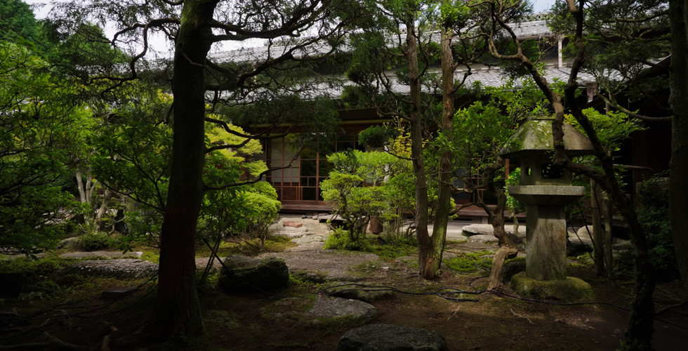 文久元年(1861)に製陶業を創業した音根氏の邸宅に造られた近代です。庭園と主屋などは塀で囲まれ、主は主の座敷の南側と西側に面しています。座敷から南を望むと右手奥に築山が見え、手前に向かって石橋のかかる流れがつくられています。庭内には花崗岩の飛び石、分岐点には大ぶりの踏分石を配置し、随所に花崗岩の景石を据えています。ドウダンツツジを中心にイロハモミジ、アカマツなどの高木の植栽が庭囲を彩ります。